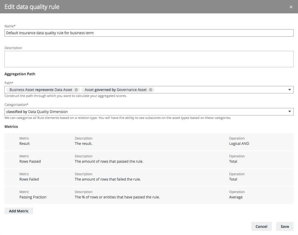 The metrics of a data quality rule define the values that are displayed in the data quality dashboard and which operation should be used when aggregating the value. These values are attributes that are available on the last asset of the aggregation path, in this example the 'Governance Asset'.