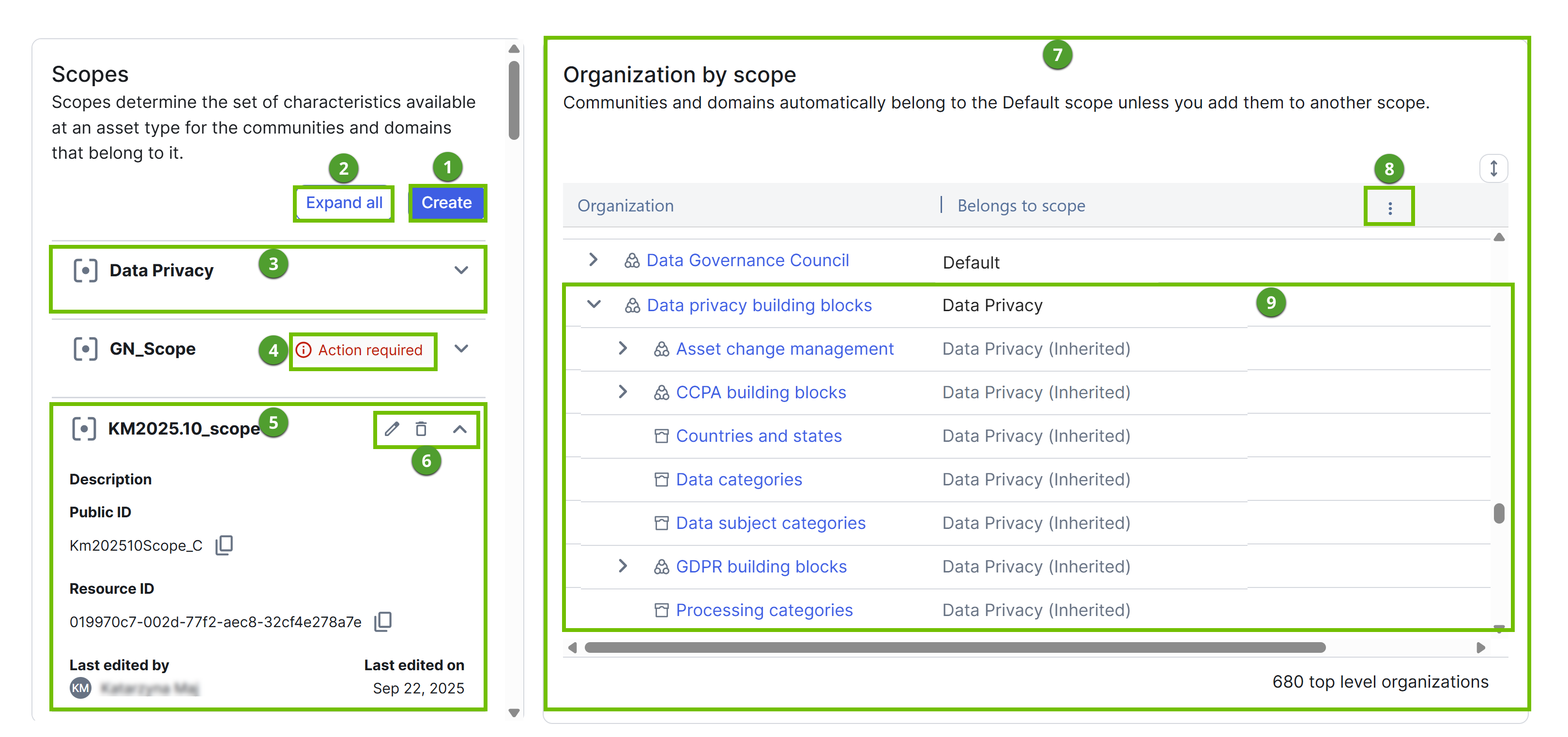 ![]() | Expand all | Button to expand all scopes. This shows metadata for each scope, including its description, public and resource IDs, audit trail (last edited by or on), and the asset types using the scope. |