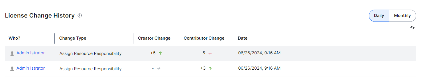 The License Change History section shows: