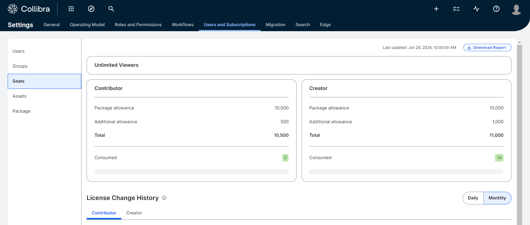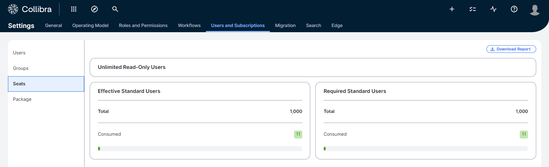 The Seats page provides an overview of the total number of licenses you are entitled to and their current consumption.
